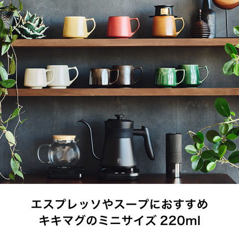 キキマグは320mlと220mlの2サイズに展開しています。この220mlは、エスプレッソのような濃いめのドリンクや、ゲストへの少量の飲み物にぴったり。市販の粉末やレトルトのスープは約150mlなので、スープマグとしてもお使いいただけます。