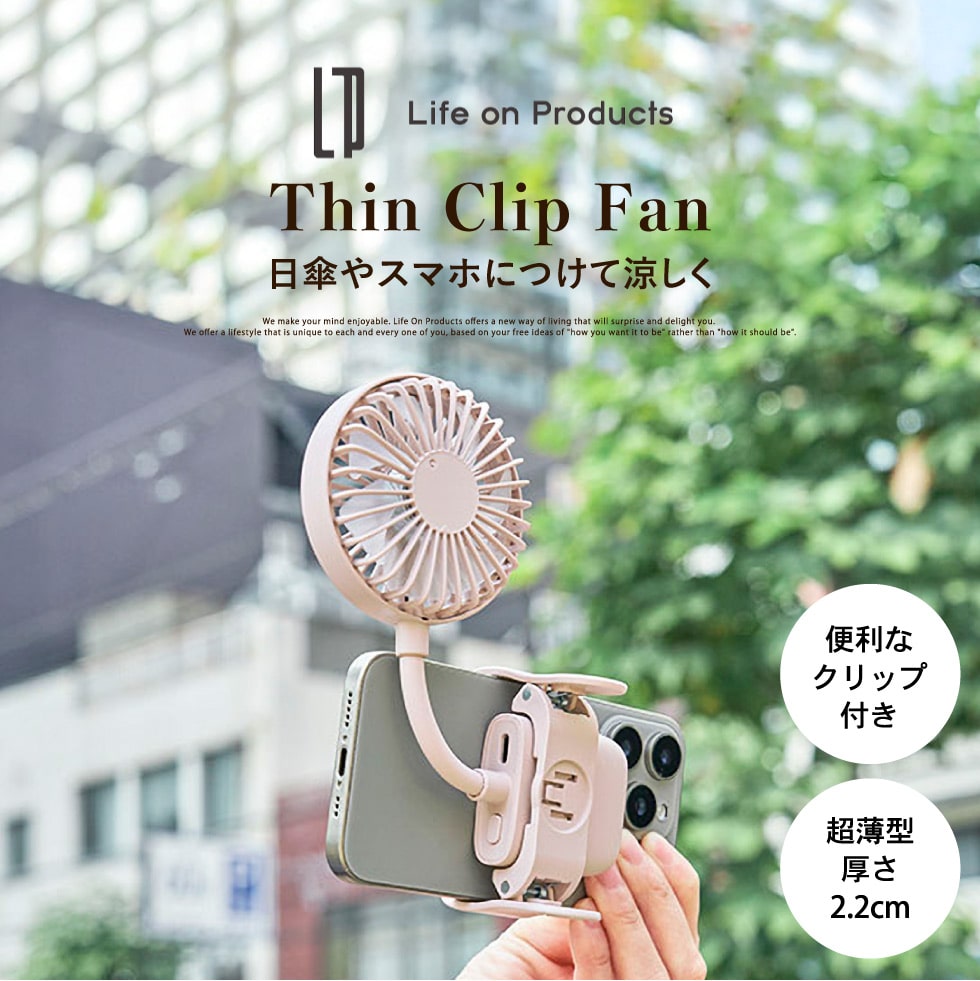 クリップで日傘やバッグに挟んだり、付属のスマホ用クリップでスマホにも取り付けられるファンです。ファンは好みの角度に調節できます。風量は弱/中/強の3段階と自然な風を再現したリズムモードを搭載、最大4.5時間使用できます。厚さ2.2cmの超薄型、軽量72gなのでミニバッグやポケットにも収納でき、手軽に持ち運べます。