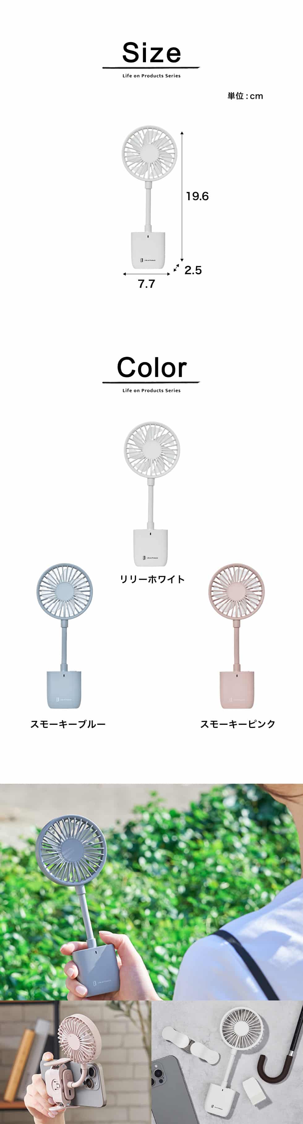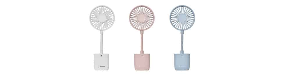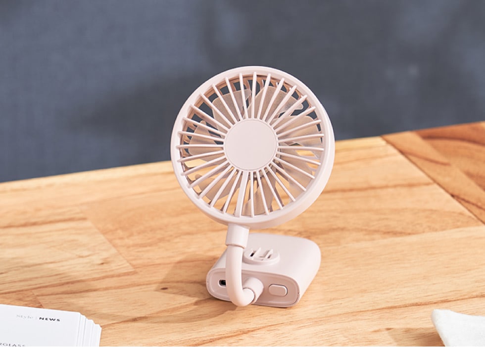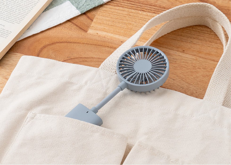 超薄型・軽量なのでミニバッグやポケットに入れて移動することができます。移動中は日傘やカバンに取り付けて使用でき、移動先ではネックを曲げて卓上で使用することも可能。オフィスやアウトドアなど様々なシーンで活躍します。