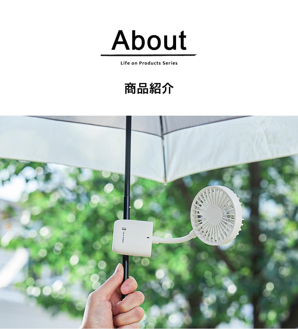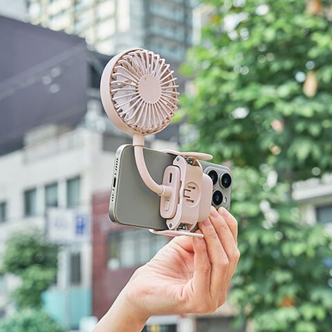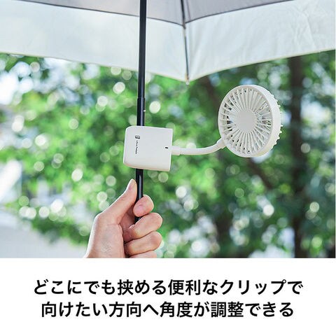 本体の背面についているクリップで日傘の柄やカバンに固定し、ネックで角度を自由に調整できます。取り外し可能なスマホ用クリップを装着すれば、通勤・通学の電車内や待ち時間に涼みながらスマホを使用できます。
