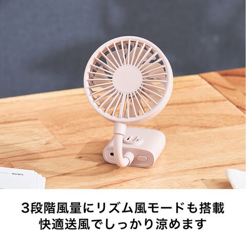風量は弱/中/強の3段階と、心地よい自然な風を再現したリズム風モードを搭載。Type-Cの充電式で、弱で4.5時間、強で2時間使用できます。ダブルクリックで電源オンになるので、バッグの中での誤作動の心配なく安心して持ち運べます。