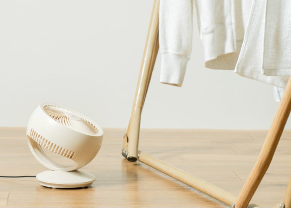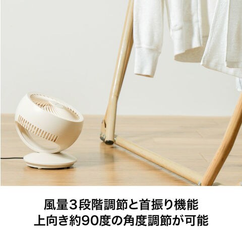 風量は弱/中/強の3段階調整と、自動で左右に首振り機能付きで、広い範囲に送風できます。また、約90度まで上向きに角度調節できるので、熱がこもりやすいキッチンや脱衣所の空気循環、室内干しの洗濯物の乾燥に役立ちます。