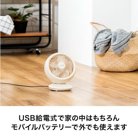 パソコンや周辺機器のUSBポートに接続でき、付属のコード1.4m以内ならどこでも使えます。室内ではデスク周りやリビングの空気循環、洗濯物への送風に便利です。お手持ちのモバイルバッテリーとつなげれば屋外でも利用できます。