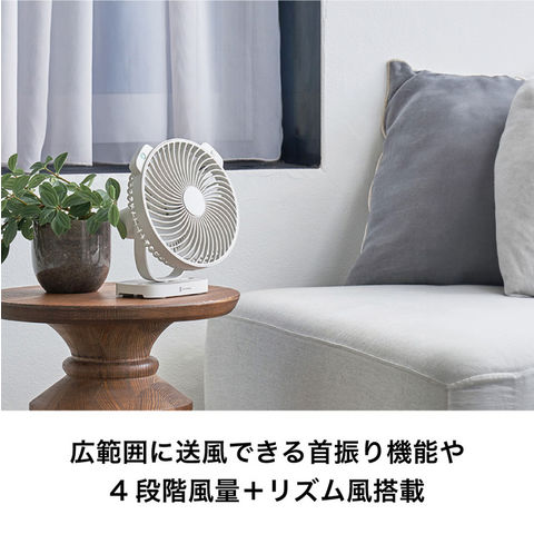 風向きは手動で上下約180°、左右360°まで調整でき、必要な場所へダイレクトに風を届けることができます。さらに、風量は4段階で調節可能で、心地よく自然な風を再現するリズム風機能も搭載しています。