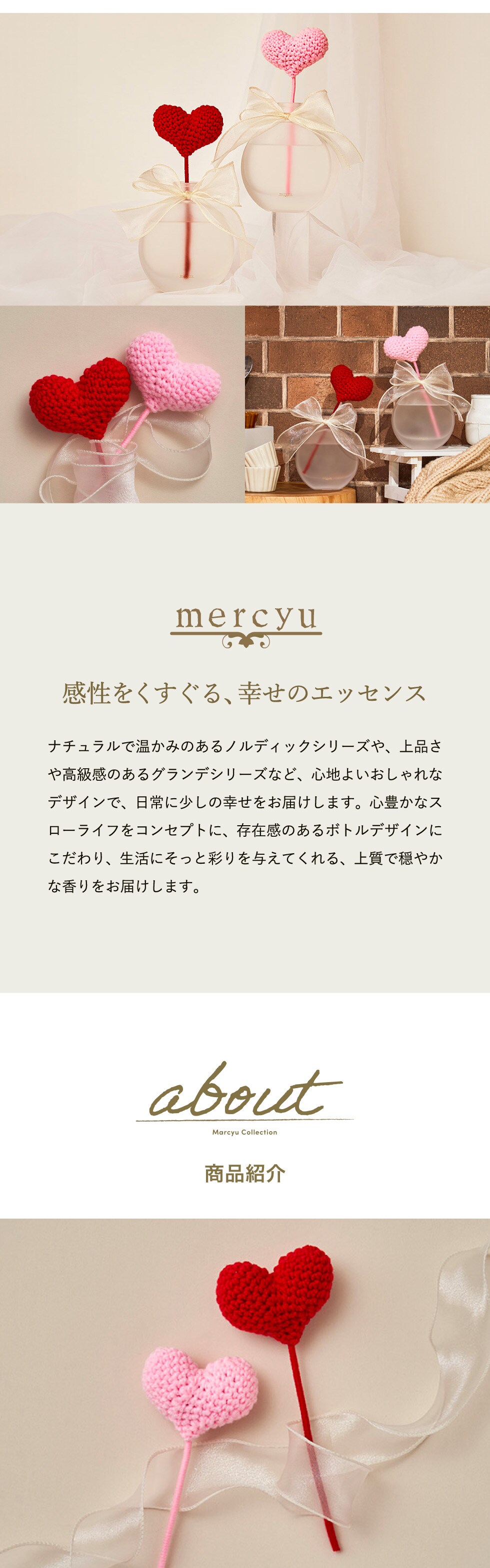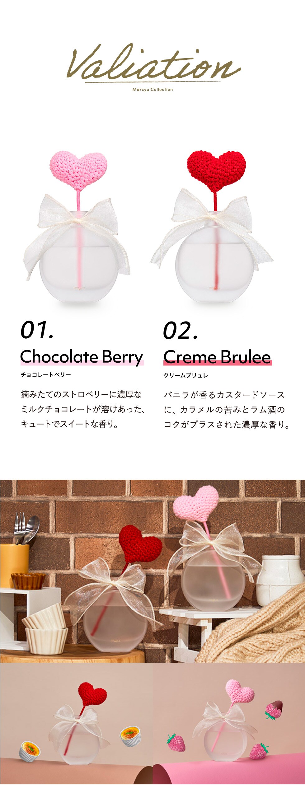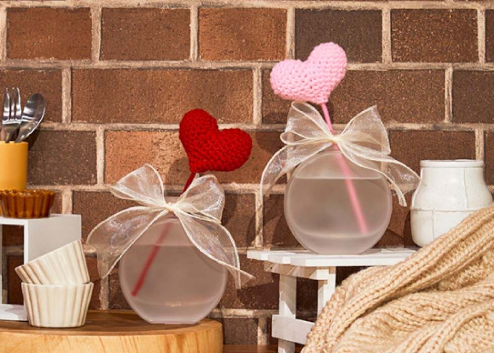 スイーツのような甘い香りに合わせ、リードスティックはふわっとやわらかな毛糸素材のハートを採用。ハートは赤とピンクの2色展開です。