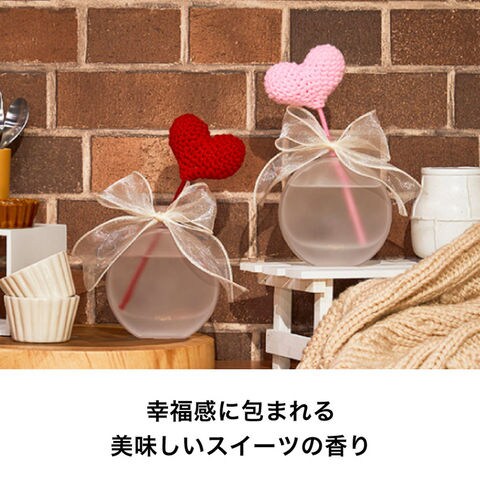 大きなハートが印象的なリードディフューザー。ハート型リードは揮発性に優れ、部屋全体に甘く心地よい香りを広げます。ボトルはスモークガラスとアイボリーのシフォンリボンが上品に調和し、まるで香水瓶のようなキュートな見た目。パッケージはハートが覗くポップで魅力的なデザインで、ギフトにもおすすめです。コンパクトで置き場所を選ばず、甘いスイーツの香りがハッピーな気分を引き出します。