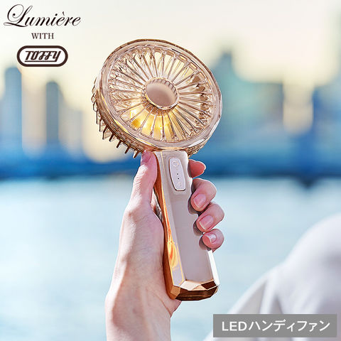 リュミエール with Toffy LEDハンディファンは、レトロなToffyのハンディファン史上、最も個性的で美しいデザインです。光をONにすると、光(リュミエール)効果で全く表情を変えて幻想的な雰囲気に。ラグジュアリーな2色展開です。