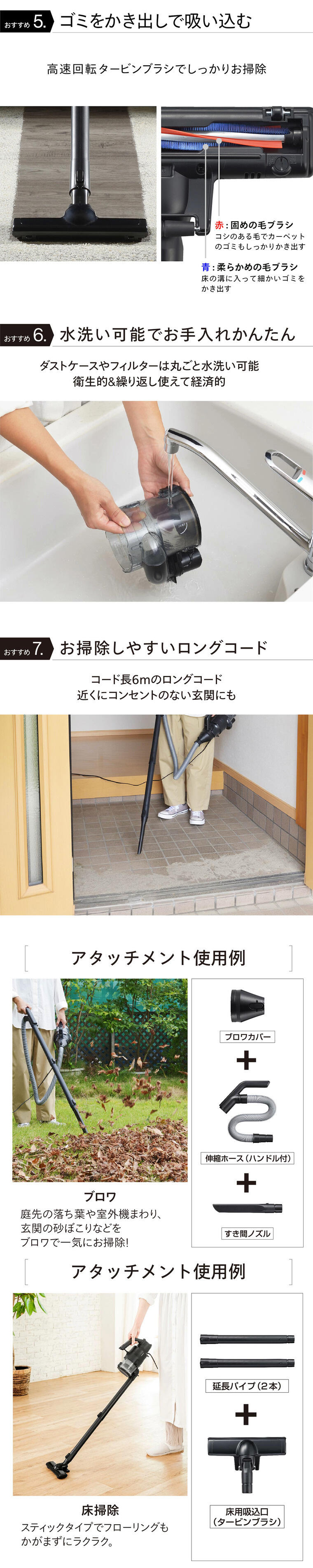 ●セット内容:延長パイプ(2本)、床用吸込口(タービンブラシ)、すき間ノズル、ブロワカバー、伸縮ホース(ハンドル付)、アタッチメント収納袋