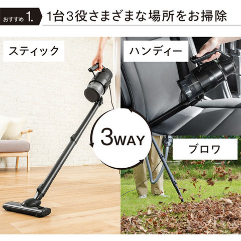 スティック・ハンディー・ブロワの1台3役の掃除機です。パワフルな吸引力と豊富なアタッチメントでさまざまな場所をお掃除。サイクロン式で吸引力も持続。さらにタービンブラシ採用でフローリングの溝やカーペットの奥のゴミをしっかり吸込みます。