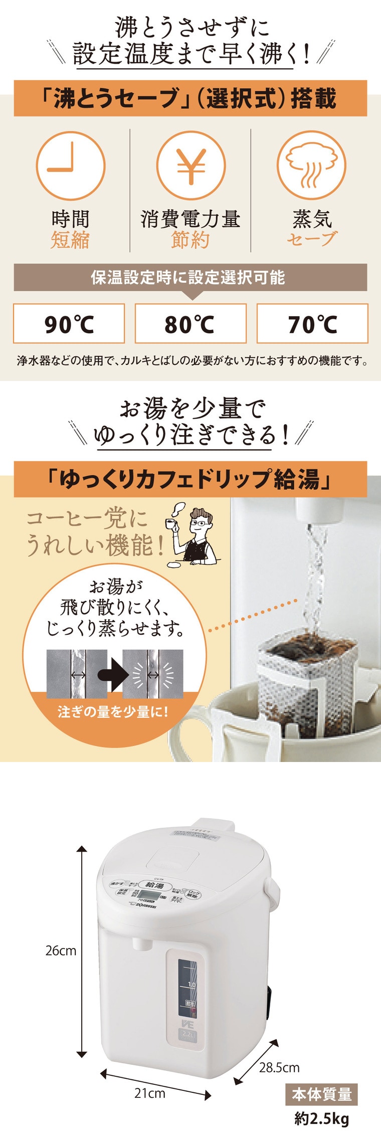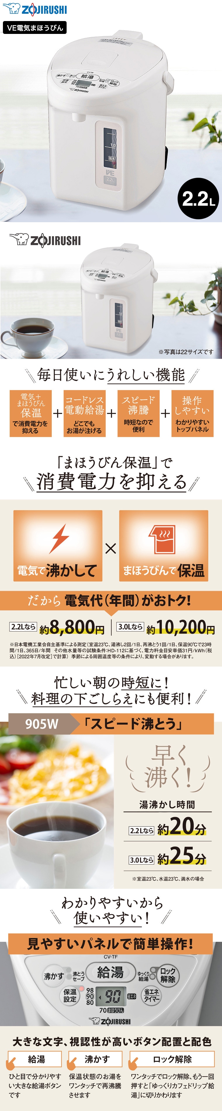 象印 VE電気まほうびん 2.2L 優湯生 マイコン沸とう CV-TF22 送料無料 / 電気ポット 湯沸かしポット 電気ケトル 98℃ 90℃ 80℃ 70℃ ミルク作り カフェドリップ スピード沸とう 省エネ ZOJIRUSHI キッチン家電 調理家電 JGS