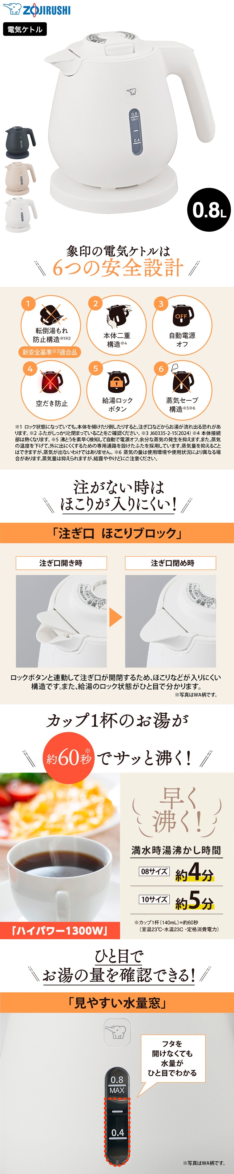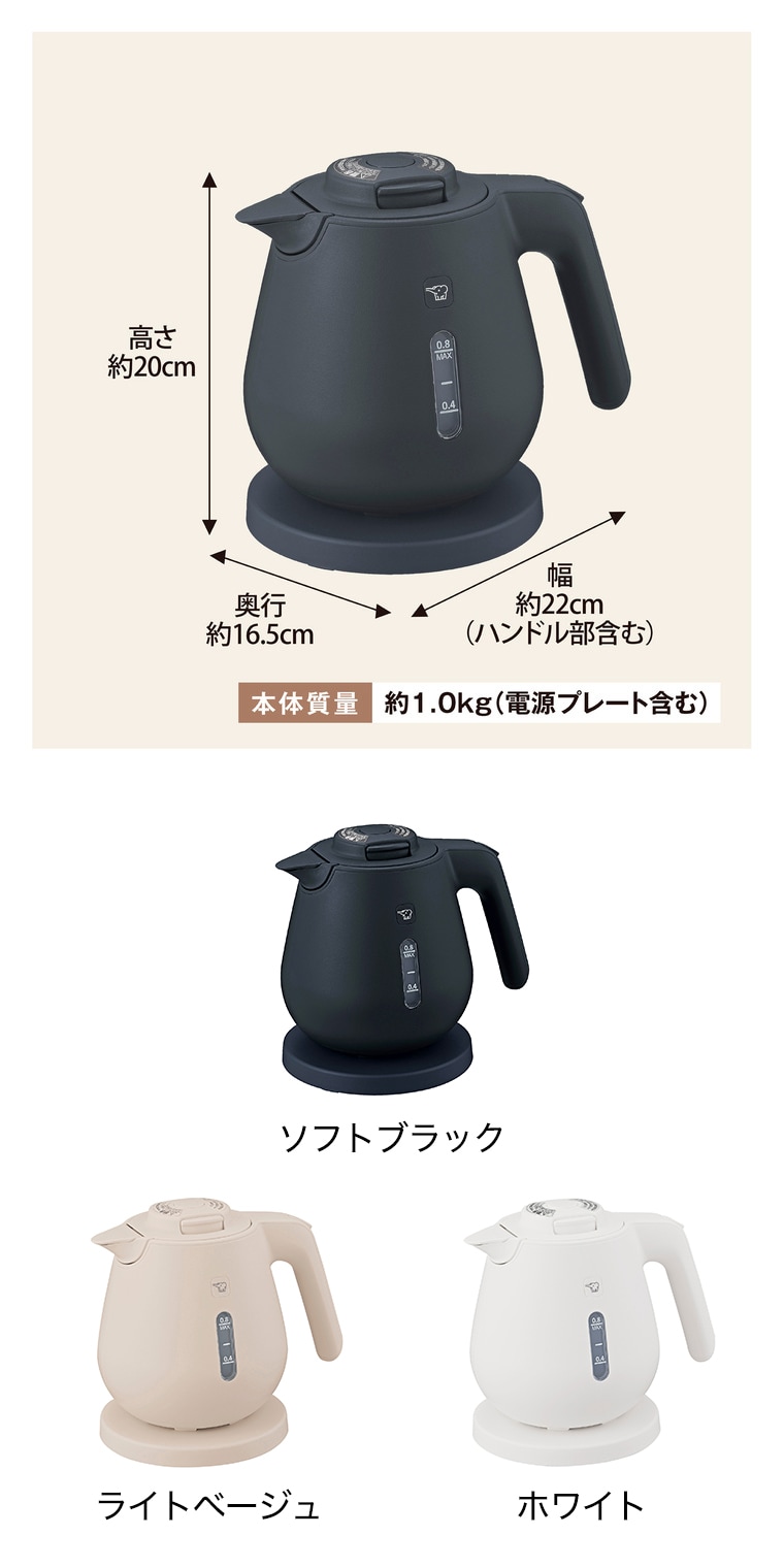 象印 電気ケトル 0.8L CK-DC08 送料無料 / ケトル 転倒お湯もれ防止 本体二重構造 蒸気レス ほこりブロック 空だき防止 電気ポット 湯沸かしポット 湯沸かし器 ホワイト ブラック ベージュ ZOJIRUSHI キッチン家電 JGS / ソフトブラック