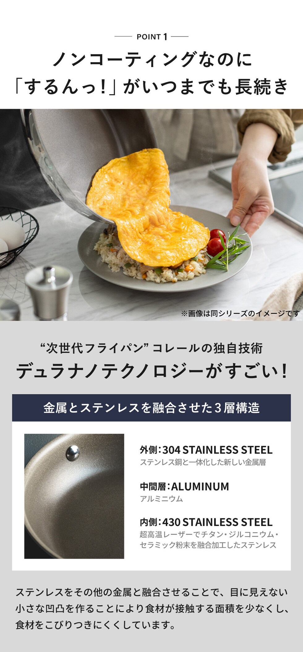 特許取得済みのドュラナノテクノロジーにて表面にコーティングをせず、8000℃の温度のレーザーで金属の粉末を溶接することにより、ノンスティック性が高く、剥がれない、削れない表面を実現。