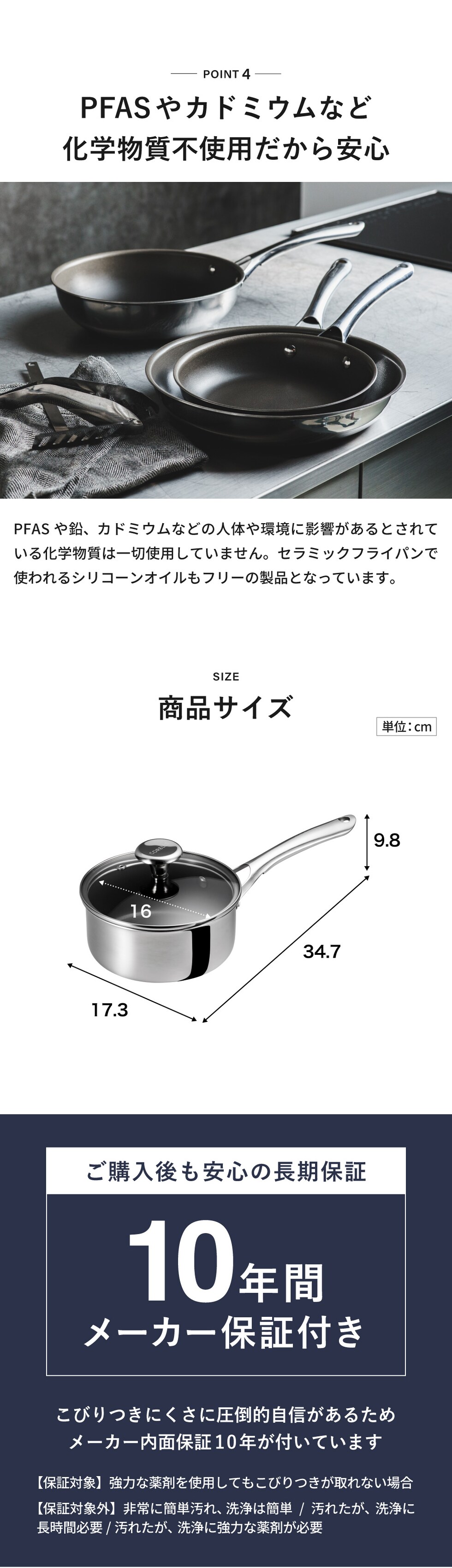 強火調理可能なので、料理も美味しくなるお鍋です。こびりつきに対して10年保証付き。
