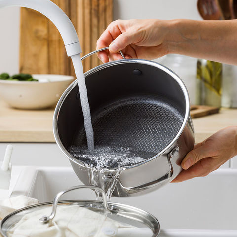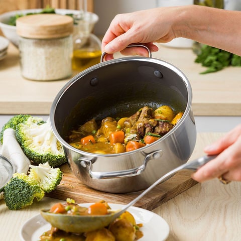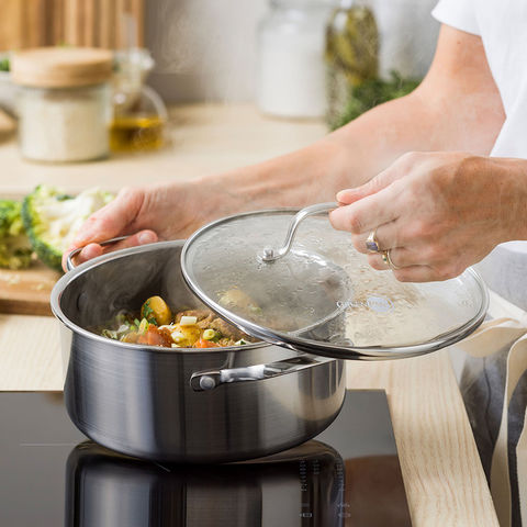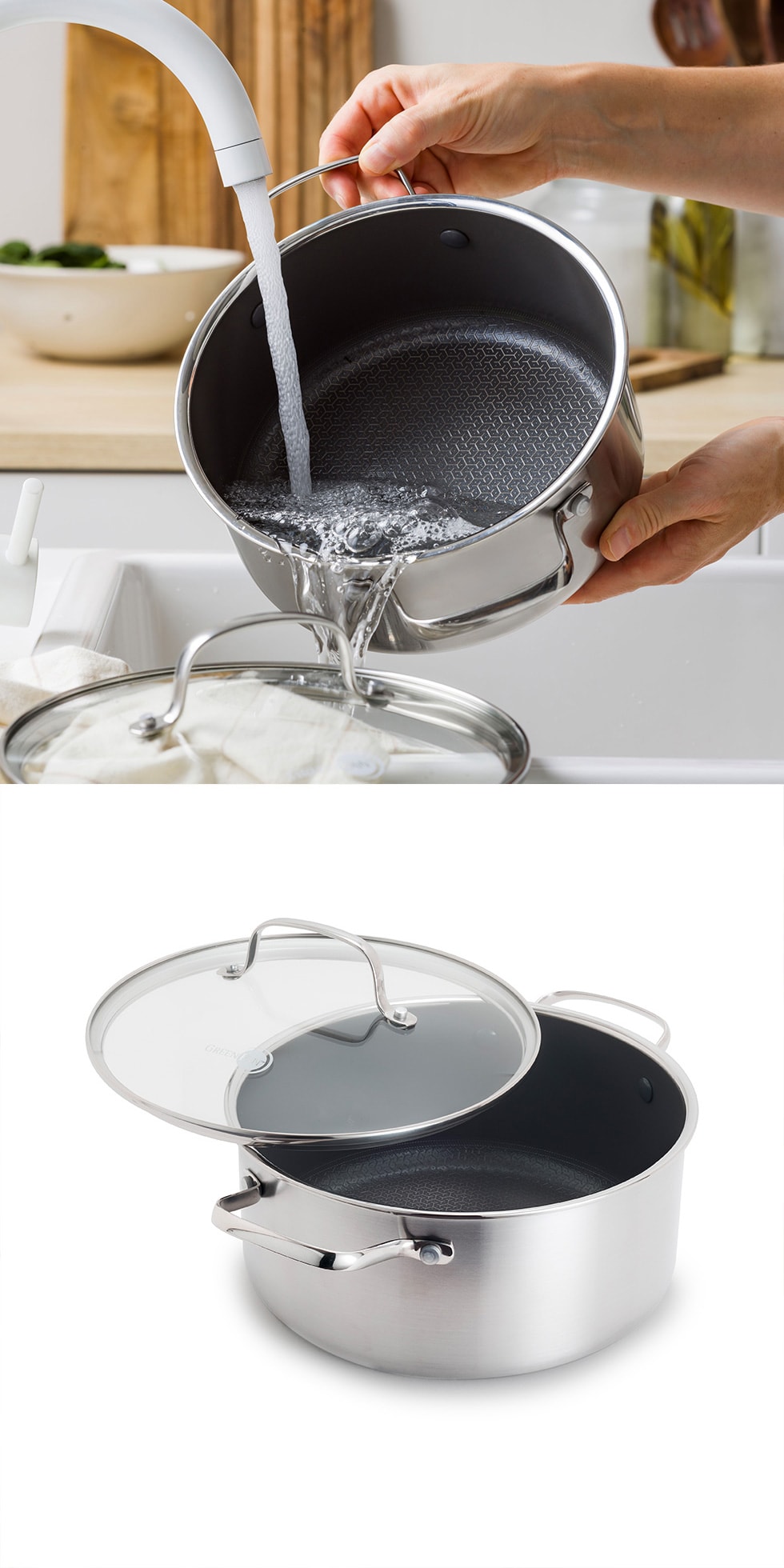 ステンレス鋼とPFASフリーのセラミックコーティングが融合した革新的なクックウェア。見た目の美しさとタフさを兼ね備えたクックウェア。PFASフリーのセラミックコーティングにはグリーンパン独自のエッチング模様を加え、耐久性をさらにアップ。セラミックコーティングはよりノンスティック性を強化し、調理・お手入れがストレスなくできます。ボディはステンレス鋼とアルミニウム合金の三層構造によってタフさを強化。