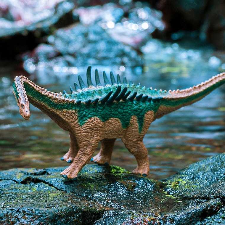 NA背中に突き出た長いトゲがひときわ個性的なアグスティニア。体の表面も硬い皮膚のプレートで覆われています。トゲや皮膚で肉食恐竜から身を守っていたと考えられています。シュライヒ 恐竜シリーズのアグスティニアも、しっかりと敵からの攻撃に備えている様を再現しています。これまでにたった1体の部分的な化石しか見つかっていません。