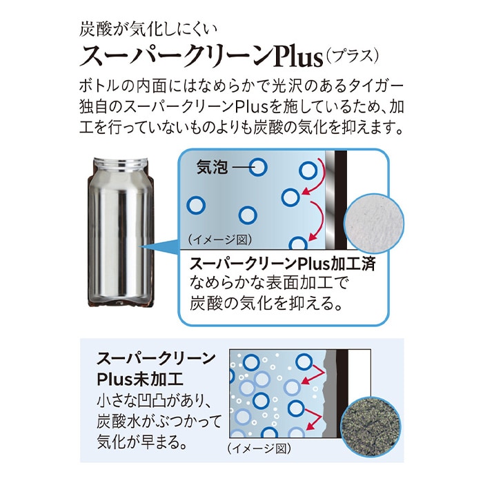 真空断熱で冷たい温度をキープし、タイガー独自のスーパークリーンPlusで炭酸長持ち。炭酸の内圧でせんが飛ばない構造を確立。