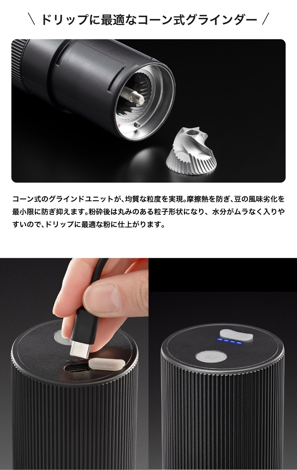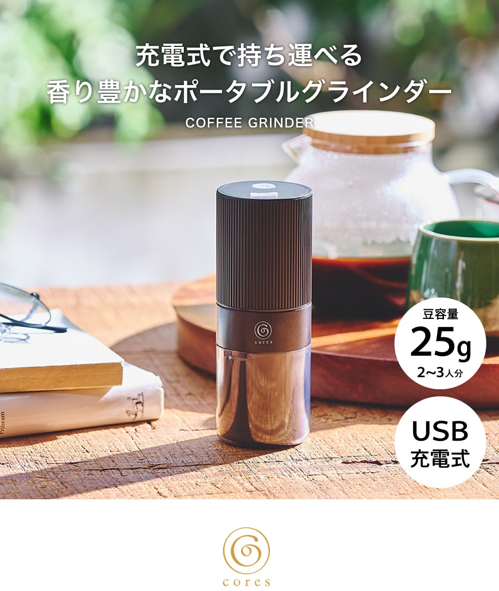 コーヒーミル 電動 Cores コレス ポータブルコーヒーグラインダー C351 送料無料 / コードレス USB充電 小型 コンパクト ポータブル 持ち運び コーン式 アウトドア キャンプ 電動ミル ドリップ コーヒー 豆挽き コーヒー豆 cores 調理家電 JGS