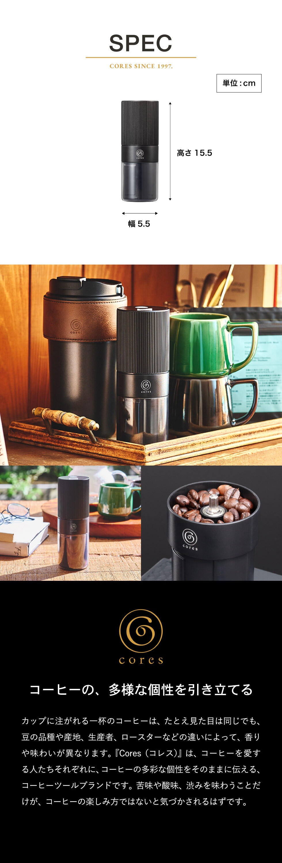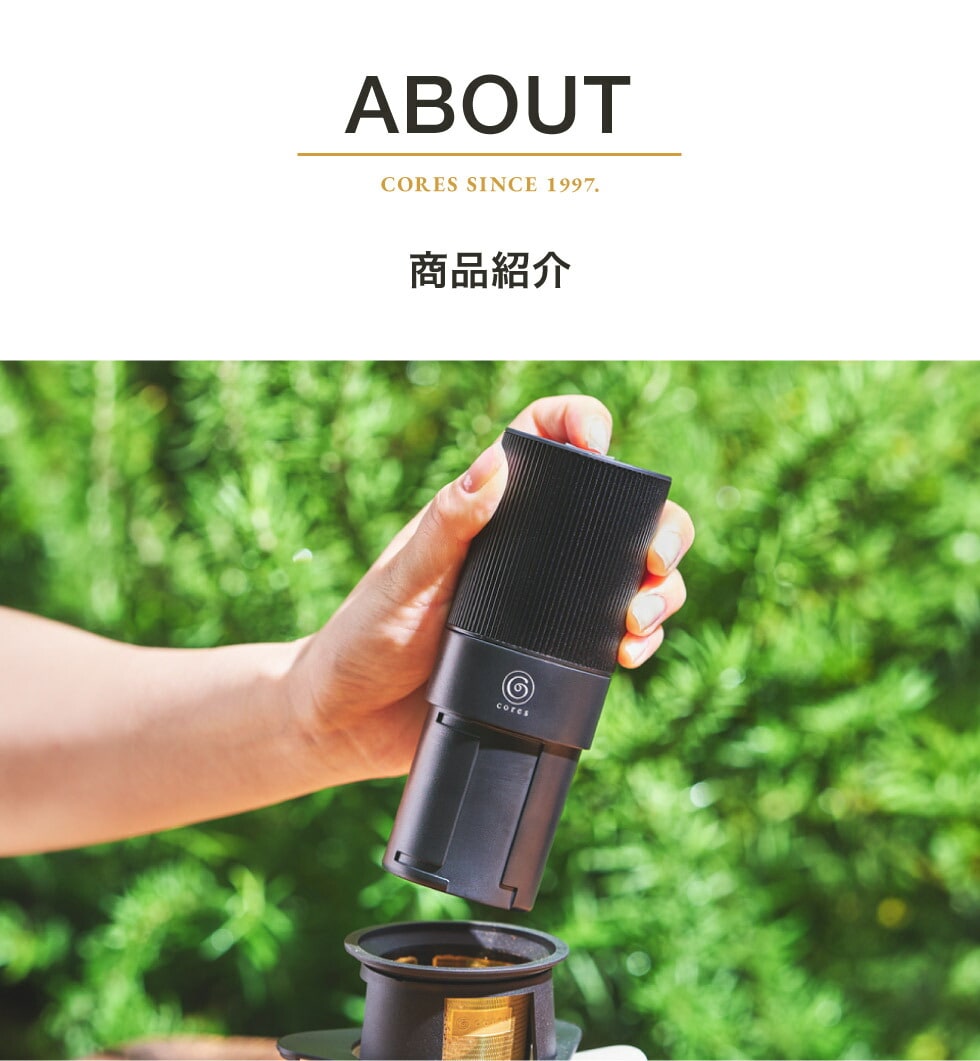 スペシャルティコーヒー器具で定評のある「Cores」より、充電式で持ち運べるポータブルコーヒーグラインダーが登場。自宅やアウトドアでも、フレンチプレスやエスプレッソ用に挽きたてのコーヒーを手軽に楽しめます。好きな場所で、自分好みの挽き目で抽出した香り高いコーヒーは、コーヒー通も満足できる味わいです。