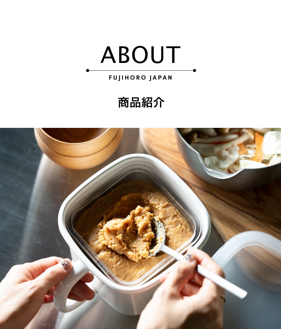 容量が大きく、角型で収納時に場所を取らないサイズ感。味噌なら市販サイズの750gがすっぽり収納できるほか、表面がガラス質でできているホーローは薬味やスパイスを入れてもニオイが移りにくく清潔です。また、熱に強い性質でコンロ調理やオーブンも使用可能(電子レンジ不可)なので、容器を調理器具としても使用できる機能性の高い容器です。