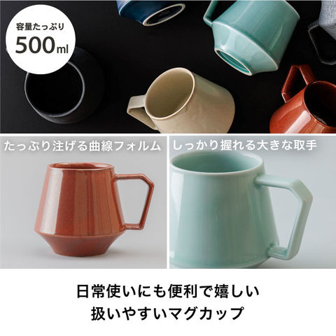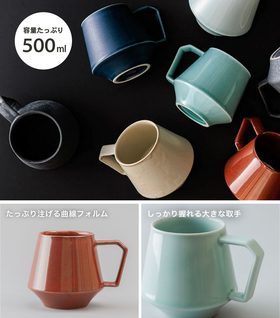「39Aritaマグカップ」は、バルーンのように膨らんだ形状でペットボトル約1本分(500ml)とたっぷり飲み物を入れることができます。取手を大きくすることでしっかりと握ることができるので、手に掛かる負担を軽減しました。