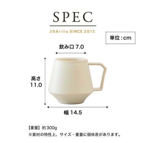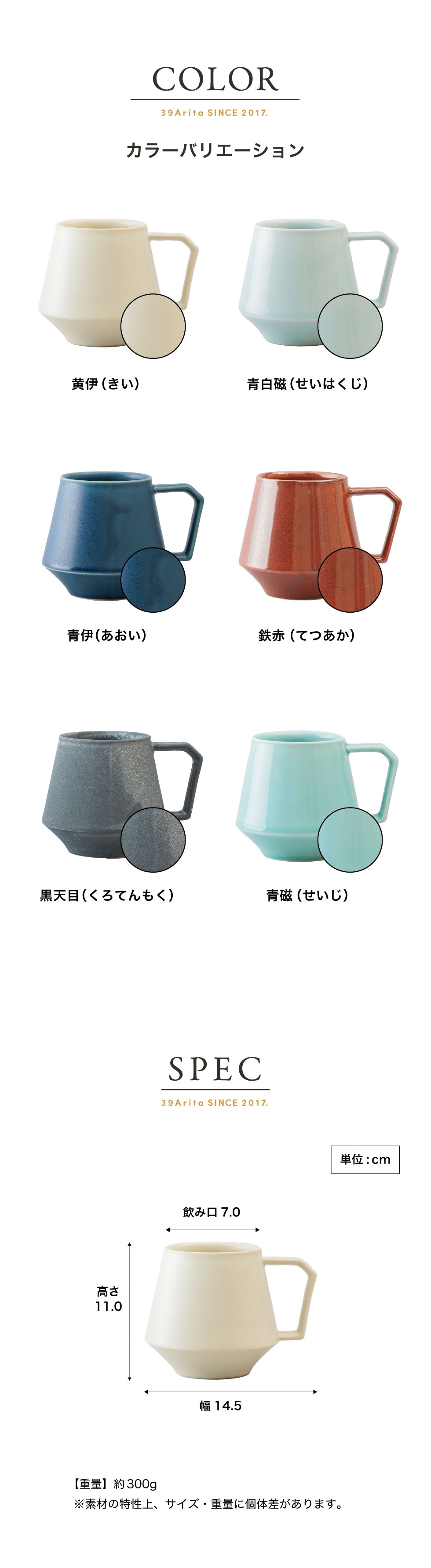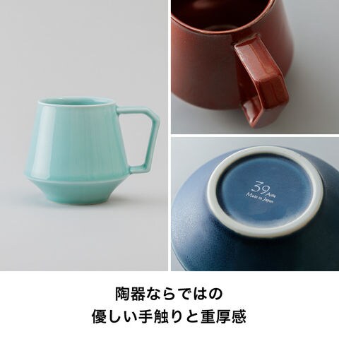 シンプルだけど温かみのあるデザインと、独特の質感・色味がオシャレな「39Aritaマグカップ」。伝統的な有田焼の製法で作られた日本製のマグカップは、釉薬によってひとつひとつ違った表情を見せる陶器製。陶器ならではのやさしい手触りと重厚感は、日本の古き良き伝統的な趣を感じさせてくれるデザインです。