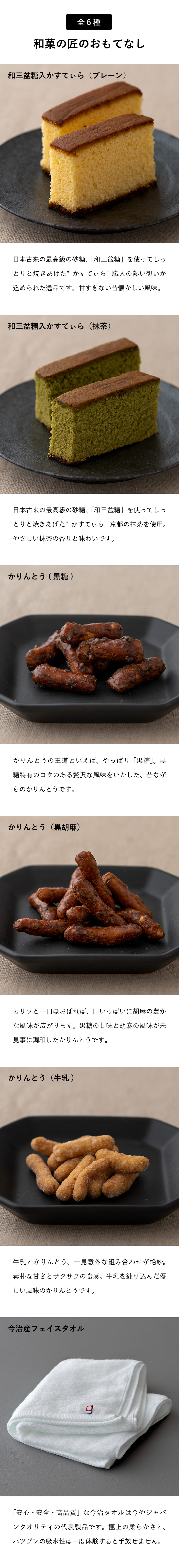 ●内容:和三盆糖入かすてぃら(プレーン・抹茶)各1本、かりんとう(黒糖×2・黒胡麻×1・牛乳×2)各15g、フェイスタオル(34×75cm)×2