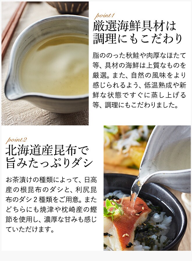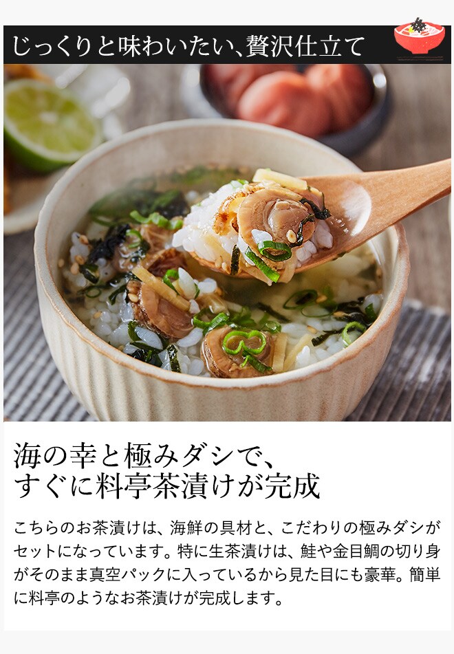 仲間とお酒を飲んだあと、夜遅くに仕事から帰ってきたとき、もしくは休日の贅沢な朝ごはんに、海鮮とだしがたっぷり入ったこだわりの生茶漬けはいかがでしょうか。ささっと作ってサラサラ食べて、そしてしみじみ味わえば、気持ちがほぐれ、もっと元気になれそう。素敵な1日のはじまりに、終わりに、とっておきのお茶漬けをどうぞ。