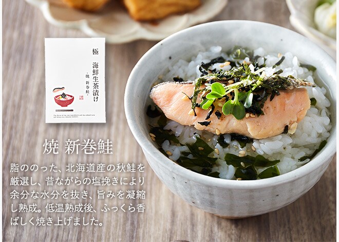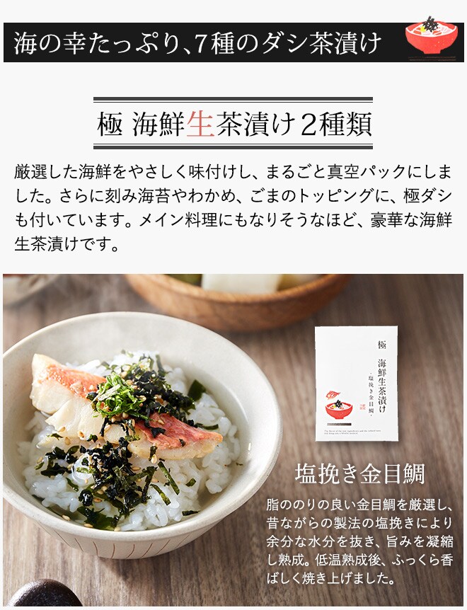 【生】海鮮茶漬け(極・根昆布だし)わかめ・白ゴマ・きざみ海苔付き(塩挽き国産金目鯛×1・北海道産 焼き新巻鮭×1)