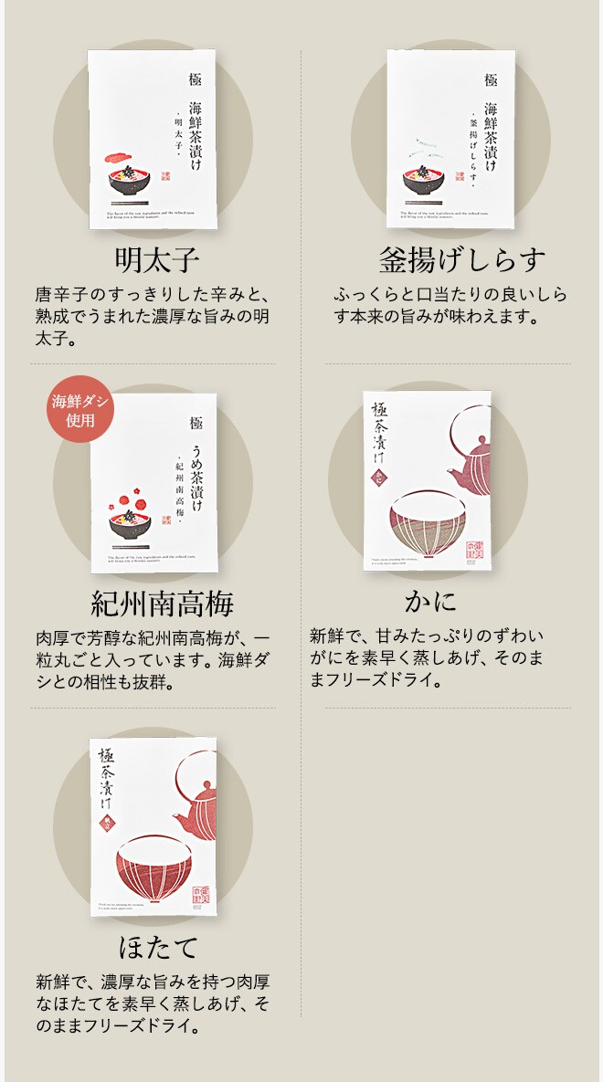 海鮮茶漬け(昆布だし)(かに×1・帆立×1・明太子×1・釜揚げしらす×2)