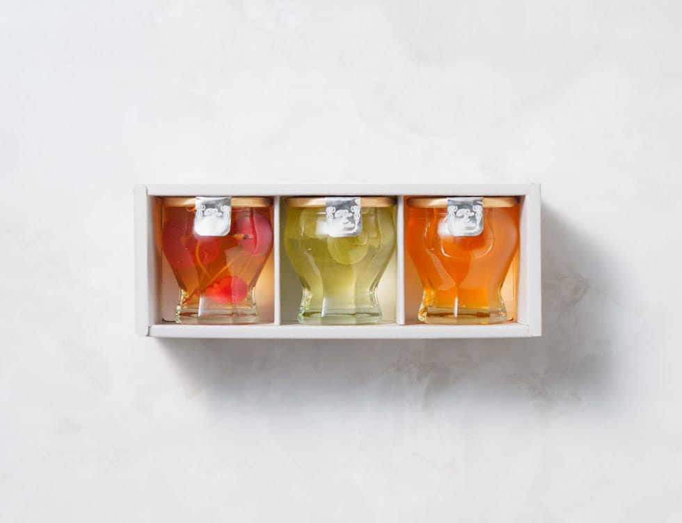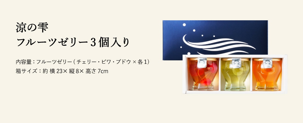 グラスのような清涼感あふれるガラス瓶にチェリーやびわ、ぶどうの果実がまるごと入った3種類のフルーツゼリー。果実のみずみずしさを爽やかな甘さのゼリーで閉じ込めました。グラスの中でキラキラと輝くその姿は、見た目からも涼を感じるとっておきのデザート。冷蔵庫でよく冷やして、ゼリーに浮かぶ果実たちとの冷たくあまいひとときを。