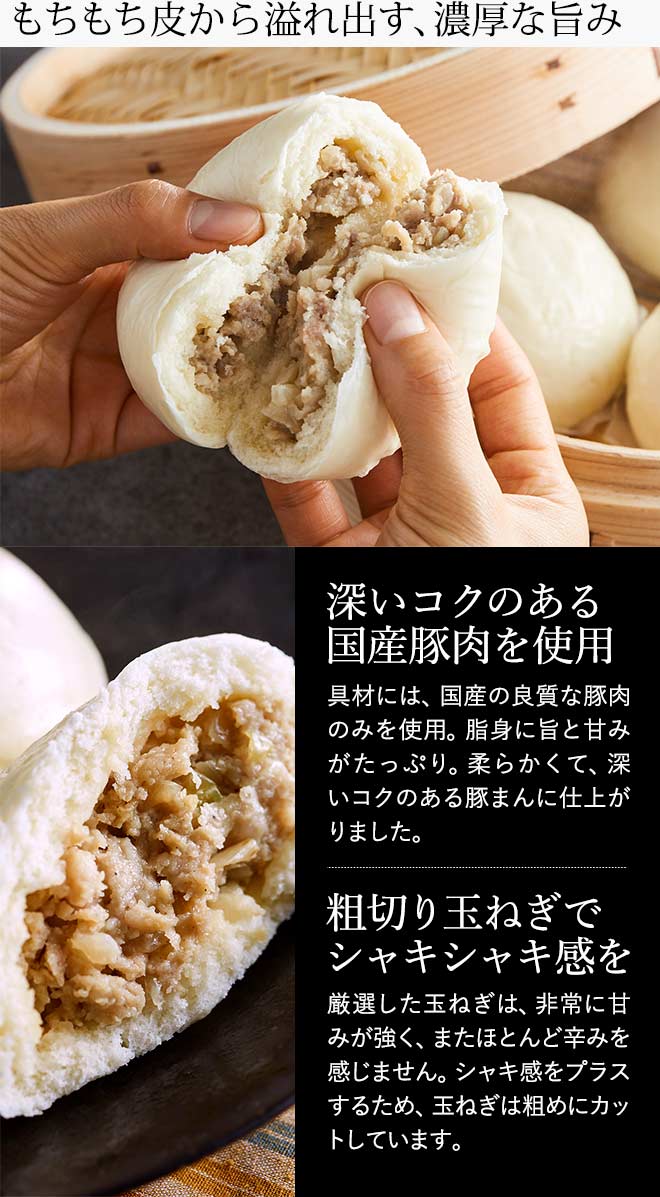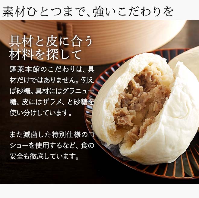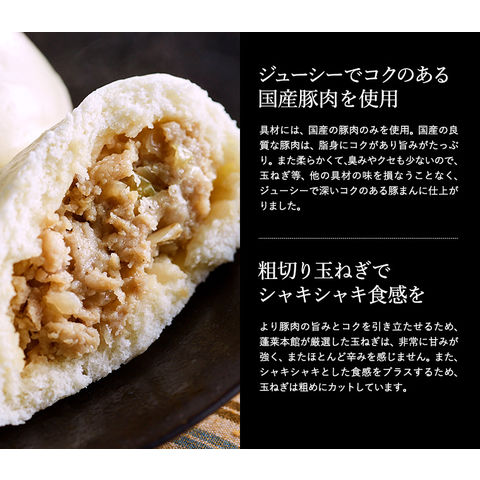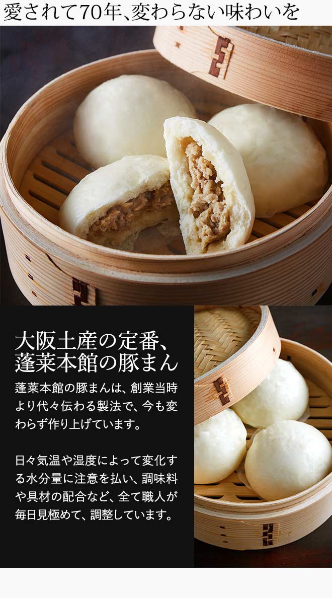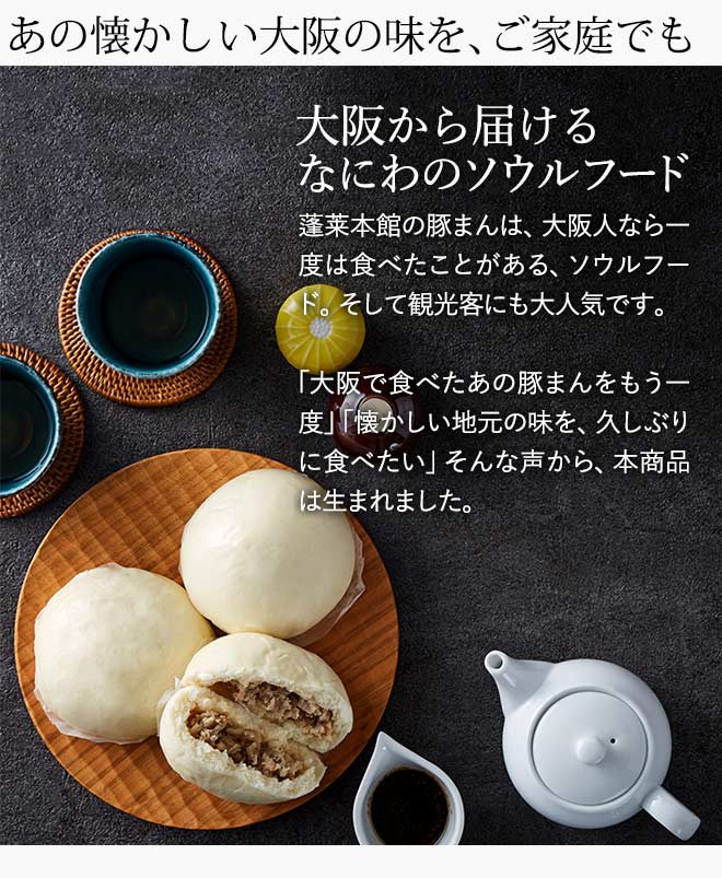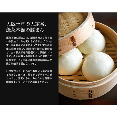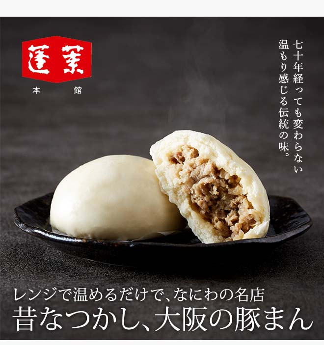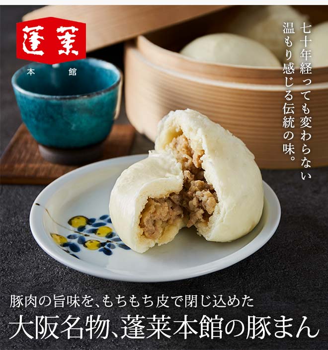 大阪土産と言えば「蓬莱本館の豚まん」。蓬莱本館の豚まんは、創業以来変わらない伝統の製法を守り続け、大阪難波で70年以上に渡り愛されています。 旨味たっぷりの国産豚肉と、甘みとシャキシャキ感がたまらない玉ねぎをぎっしりと、もちもちの生地で包み込みました。 手にとればずっしり重たく、一口噛めば具材があふれでてきそう。どこか懐かしくあたたかい、大阪名物の蓬莱本館 豚まんをご自宅で、お土産や贈り物にも是非どうぞ。 |