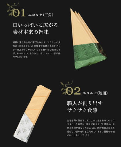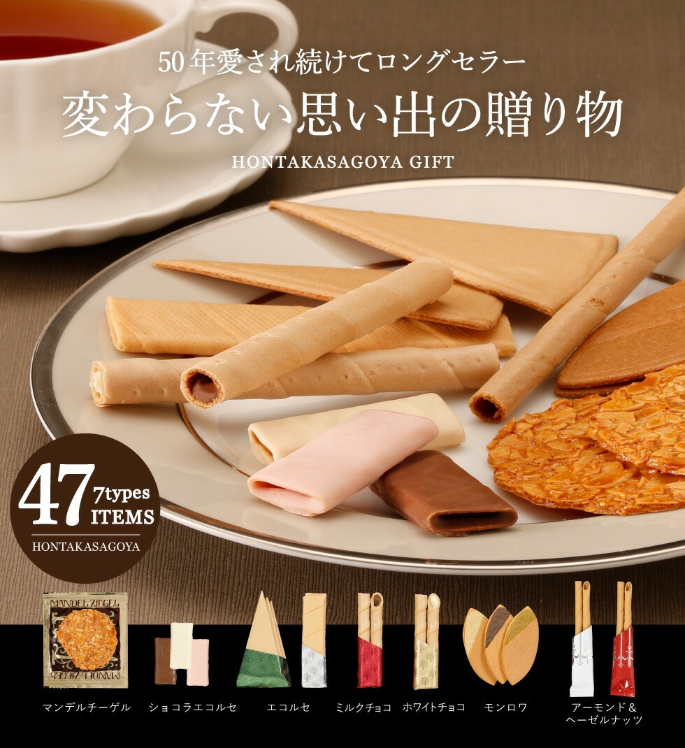 長年愛され続けてきた本高砂屋の「エコルセ」やアーモンドの風味豊かな「マンデルチーゲル」など。エコルセを中心にさまざまなバリエーションを種類豊富に取り揃えた贅沢な詰め合わせ。一つずつの個包装なので、お祝いや、お歳暮などの贈り物にもぴったりです。 |