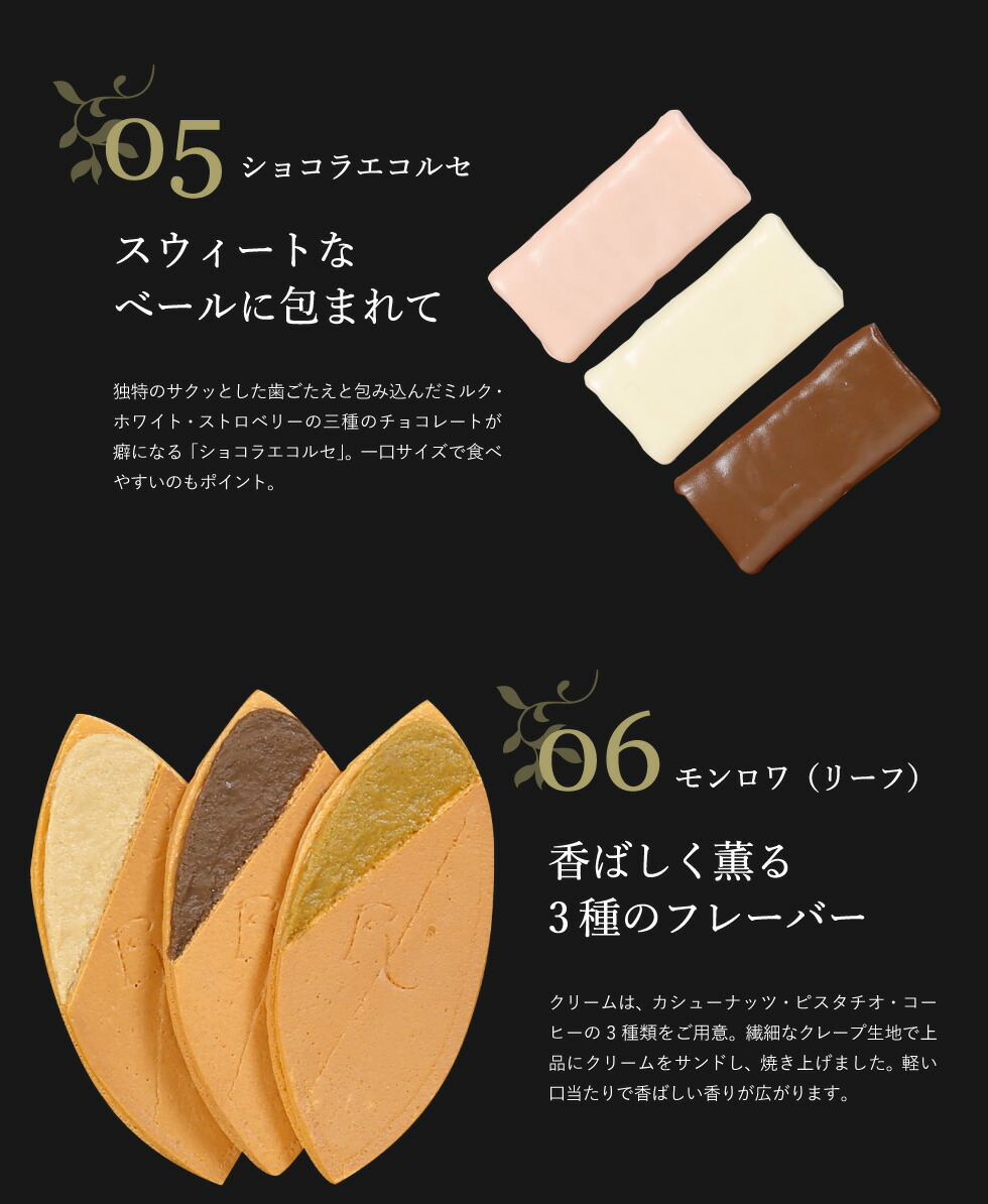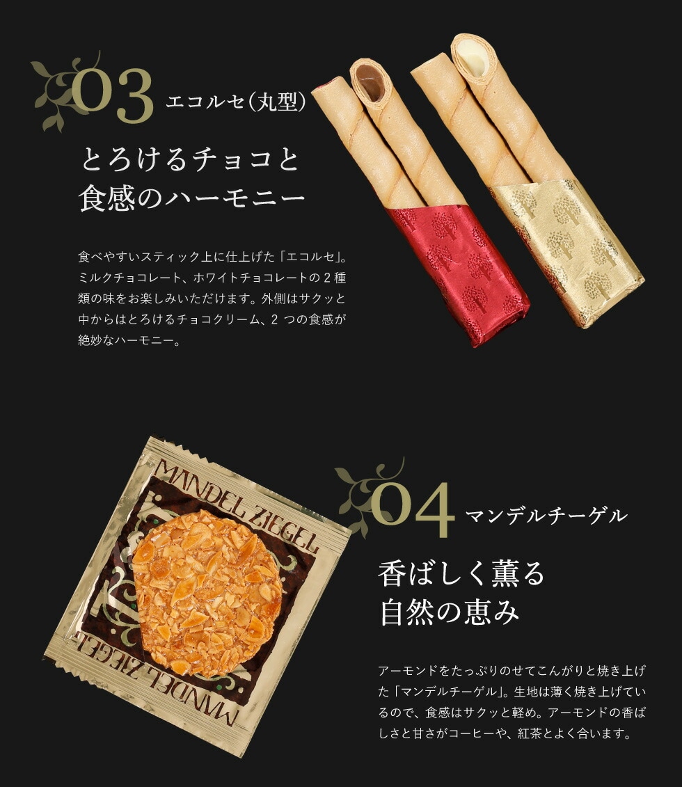 ●内容:エコルセ14包、マンデルチーゲル6枚、モンロワ12包、ショコラエコルセ15枚