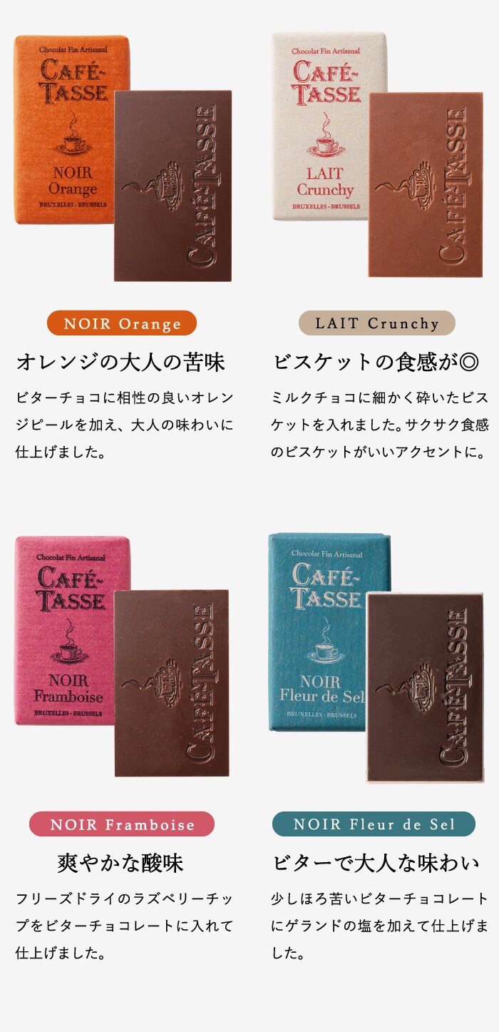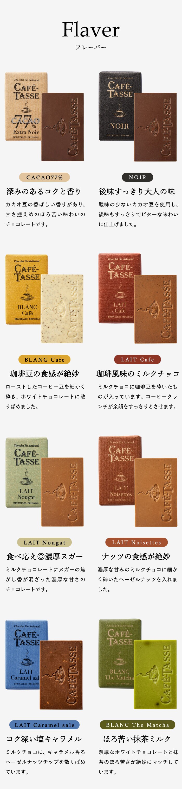 (カカオ77%、ビター、塩ビター、オレンジビター、ラズベリービター、塩キャラメルミルク、コーヒーミルク、ヘーゼルナッツミルク、ヌガーミルク、クランチーミルク、コーヒーホワイト、抹茶ホワイト)×各2枚
