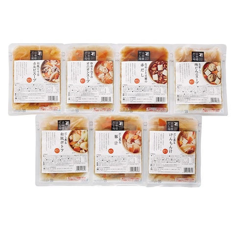 素材の旨みが溢れ出す贅沢なだしスープ。本枯鰹節だしを効かせた、風味豊かで上品なだしスープを7種類詰合せました。だしが染み込んだ大きな具材は食べ応え十分です。