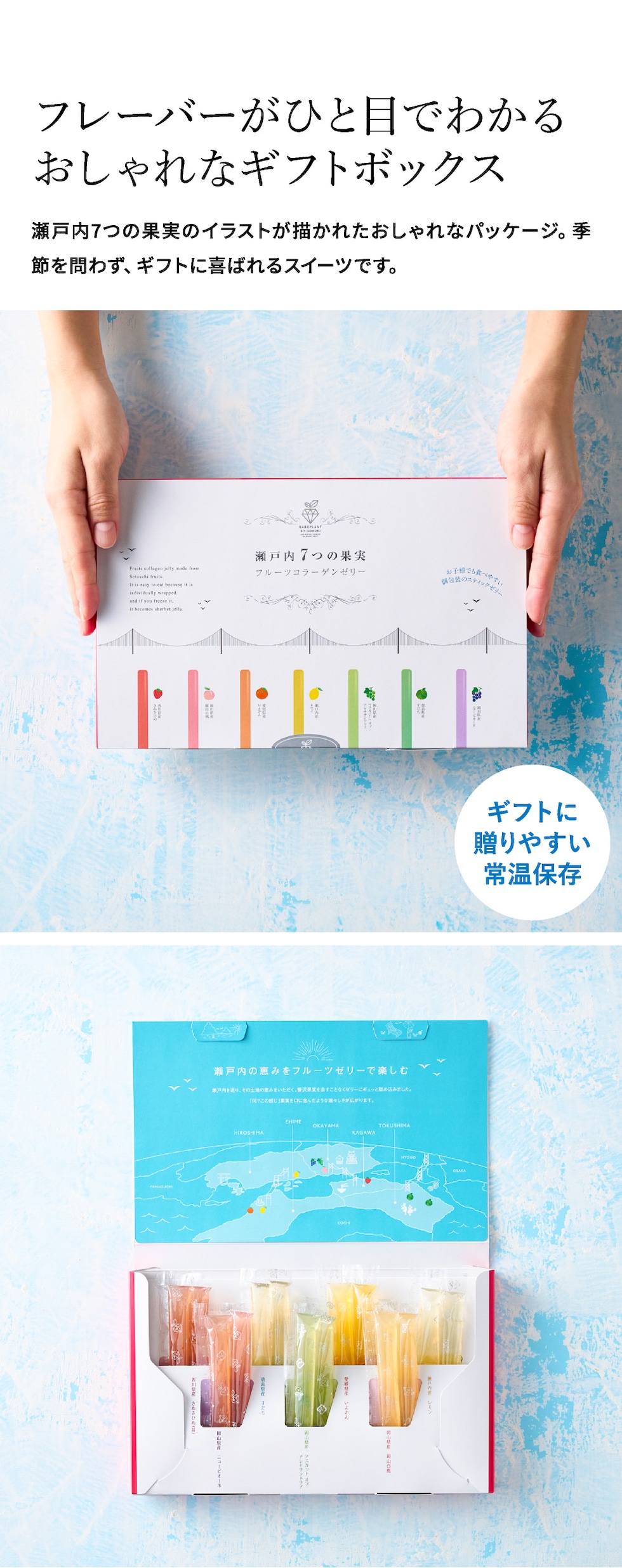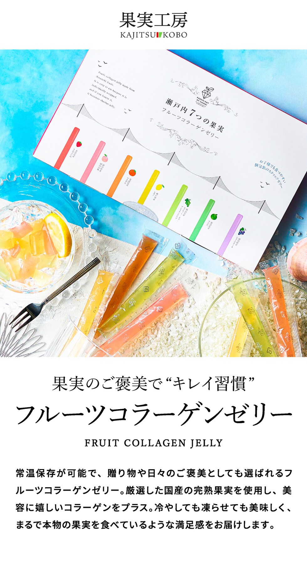 果実工房 瀬戸内7つの果実 フルーツコラーゲンゼリー 10564 / 洋菓子 コラーゲンゼリー フルーツゼリー 国産 瀬戸内 スティックタイプ 個包装 低カロリー 凍らせてもおいしい 詰め合わせ 写真 メッセージカード オシャレ ギフト gws 食べ物