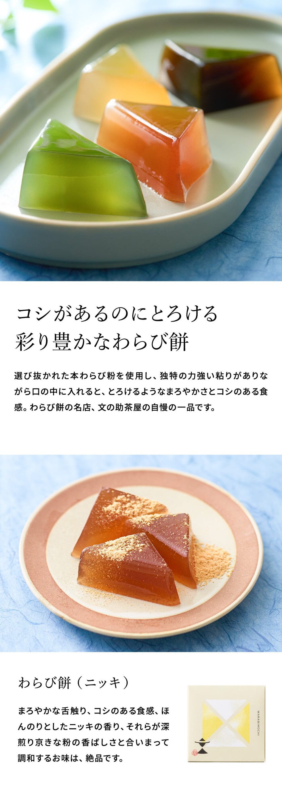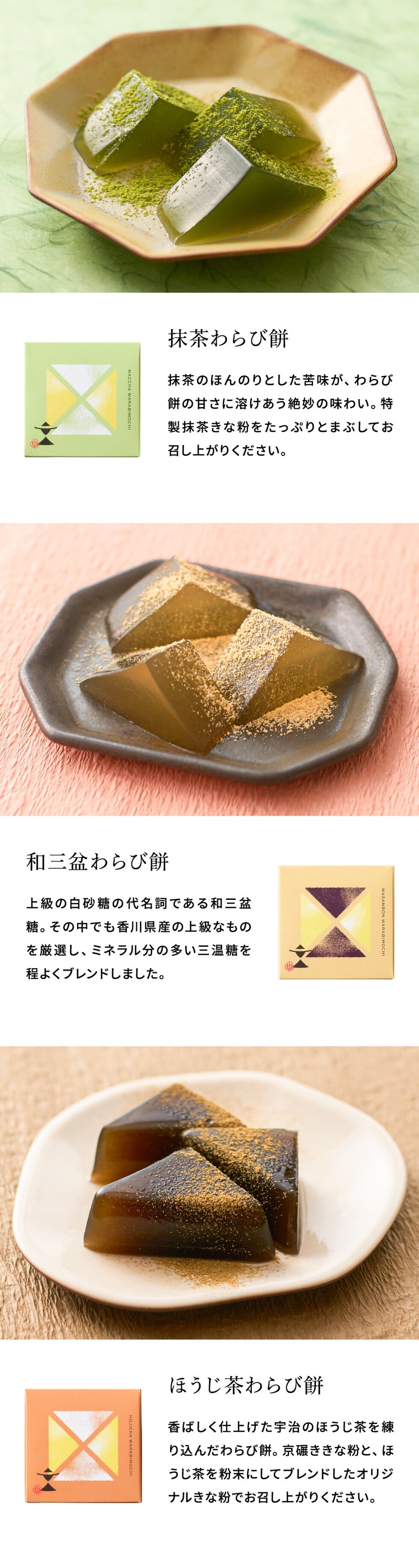 〈わらび餅〉上白糖(国内製造)、和三盆糖、三温糖、本わらび粉、寒天/ゲル化剤(増粘多糖類)、〈別添きなこ〉大豆