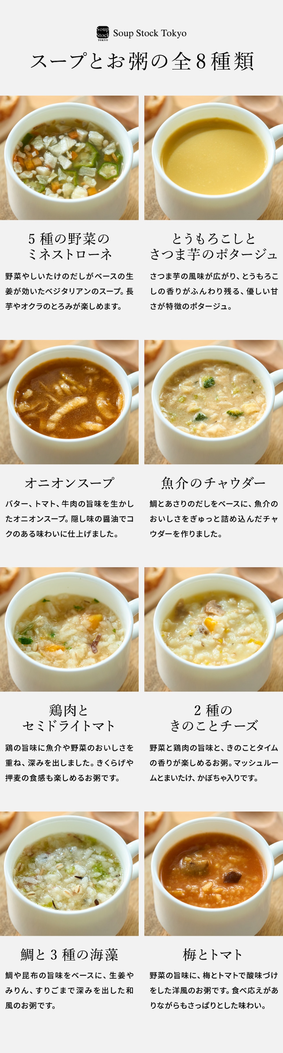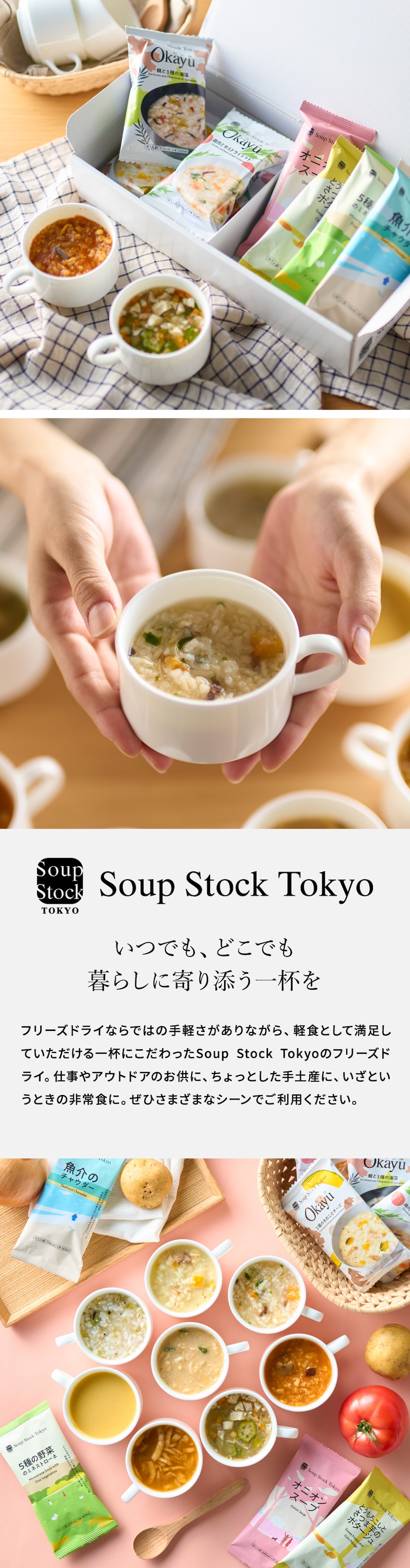 ●内容量:Soup オニオンスープ14.7g・Soup 5種の野菜のミネストローネ11.8g・Soup 魚介のチャウダー17.0g・Soup とうもろこしとさつま芋のポタージュ20.5g・Okayu 2種のきのことチーズ21.4g・Okayu 鶏肉とセミドライトマト17.4g・Okayu 鯛と3種の海藻16g・Okayu 梅とトマト16.3g