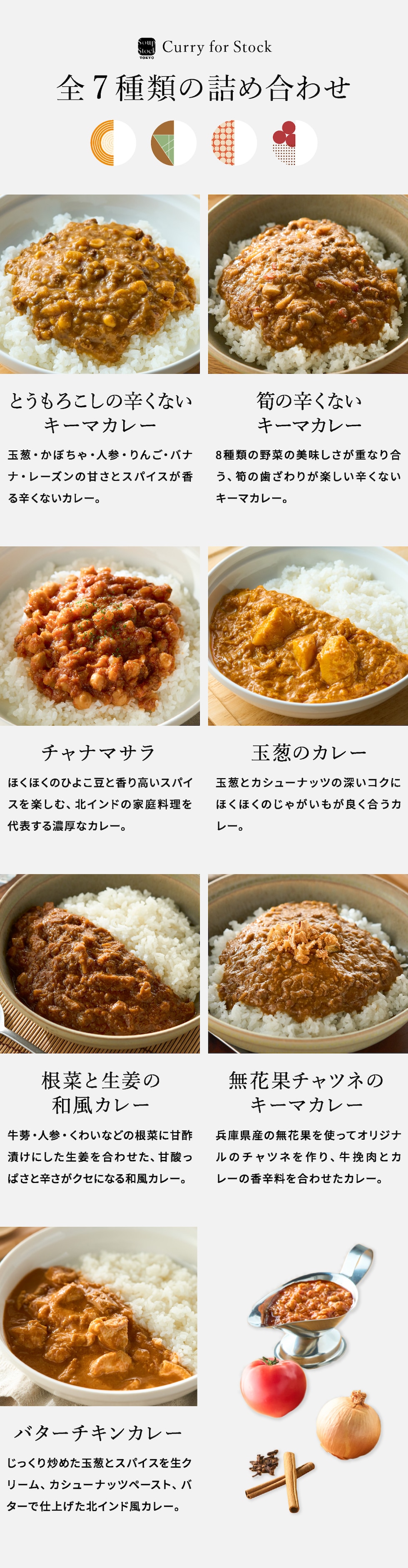 ●内容量:とうもろこしの辛くないキーマカレー180g×2、根菜と生姜の和風カレー・無花果チャツネのキーマカレー・チャナマサラ・玉葱のカレー・筍の辛くないキーマカレー・バターチキンカレー各180g×1