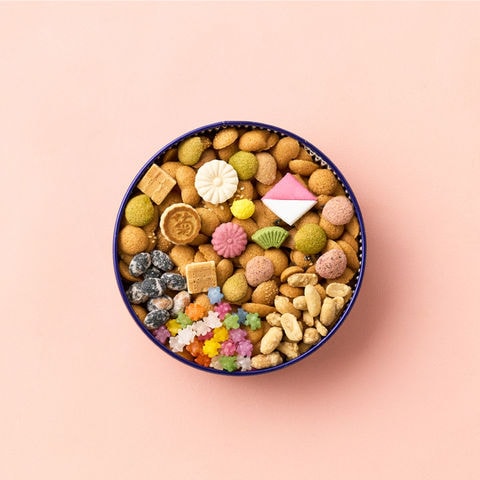 ●原材料:小麦粉(小麦(北海道産))、砂糖、鶏卵、和三盆糖、落花生、大豆、ごま、黒糖、抹茶、しそ粉(しそ、食塩、梅酢)、生姜粉末、ココナッツ、けしの実、ココア、青海苔、豌豆粉、餅米粉、澱粉、水飴、食用精製加工油脂、食用植物油脂、食塩/着色料(ビートレッド、クチナシ色素、ベニバナ色素、パプリカ色素、カラメル色素、ベニコウジ色素)、香料、酸味料、乳化剤