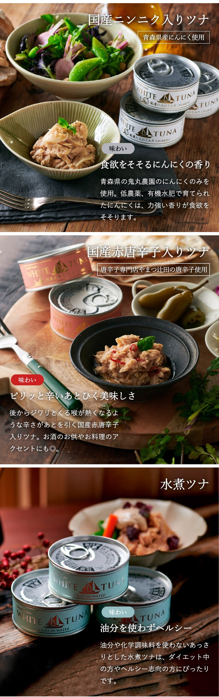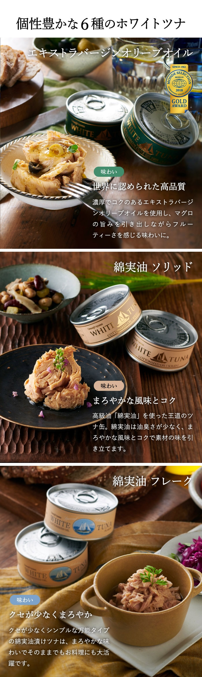 ●内容量:6缶(オリーブオイル(ソリッド)・綿実油(ソリッド)・綿実油(フレーク)・水煮(ソリッド)・国産赤唐辛子入り(フレーク)・国産にんにく入り(フレーク))90g入り×各1缶