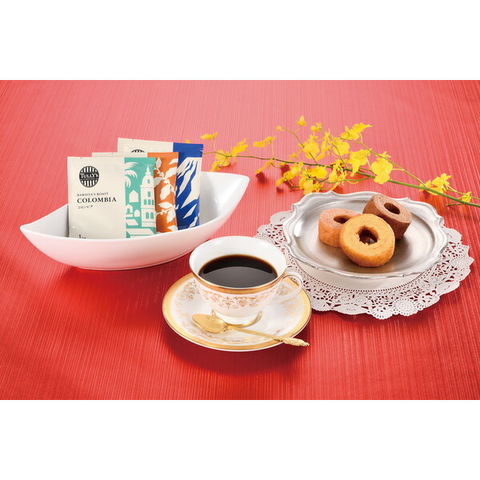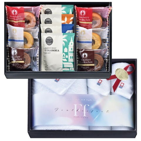 ●内容量:プレーンバームクーヘン、ショコラバームクーヘン、あまおうバームクーヘン×各2、タリーズドリップコーヒー(キリマンジャロ・ブラジル×各1、コロンビア×2)、今治バスタオル(60×120cm)×1、今治フェイスタオル(34×75cm)×2