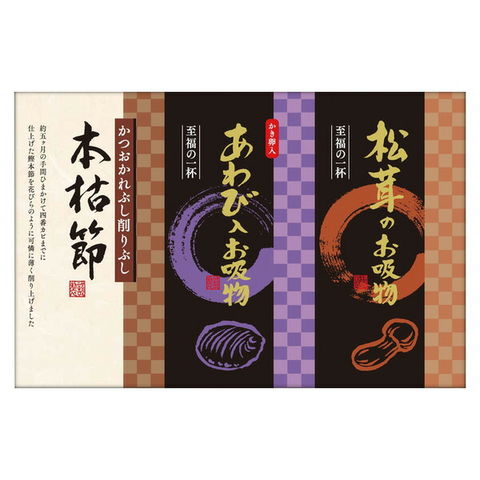 ●内容量:あわび入お吸い物(4g×1袋)、松茸のお吸い物(4.2g×1袋)、本枯れ節削り節(2g×2袋)×各1