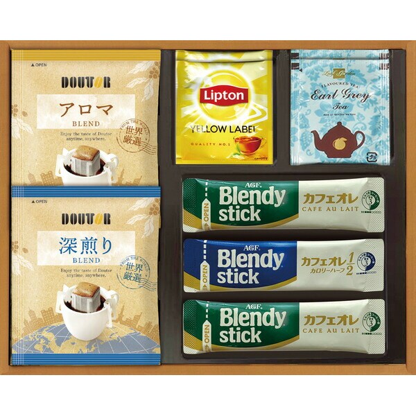 ●内容量:ドトールドリップコーヒー(アロマブレンド×1、深煎りブレンド×1)、リプトンイエローラベル×2、アールグレイ紅茶ティーバッグ×2、ブレンディスティックカフェオレ×2、ブレンディスティックカフェオレ(カロリーハーフ)×1