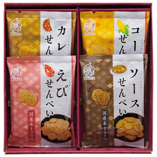 国産米を100%使用しカリッと口いっぱいに広がる香ばしいえびの風味で後引く旨さのえびせんべい、スイートコーンの甘さが引き立つ、香ばし醤油仕立てのコーンせんべい、せんべいの生地にあおさ海苔を練り込み磯の香り、ソースの旨み、酸味、懐かしさを堪能できる味に仕上げたソースせんべい、カリッと、シンプルな美味しさでお米を味わうあっさりうま塩せんべい、スパイシーなカレー風味で お米とカレーのゴールデンコンビのカレーせんべいをセットした米菓詰合せです。