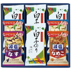 ●原材料:●しじみ醤油味付のり(8切8枚×3袋)×2:幹のり(有明海産)、しょうゆ加工品(しょうゆ(小麦・大豆を含む)、ぶどう糖果糖液糖、砂糖、水あめ、しじみ、鰹エキス、昆布エキス)、砂糖、醸造調味料、食塩、鰹節エキス、酵母エキス、昆布エキス、L-オルチニン塩酸塩/調味料(アミノ酸等)、香辛料抽出物 ●有明海産味付のり(8切8枚×3袋)×3:幹のり(有明海産)、砂糖、みりん、しょう油(小麦・大豆を含む)、食塩、唐辛子、煮干、昆布/調味料(アミノ酸)、ソルビット