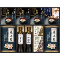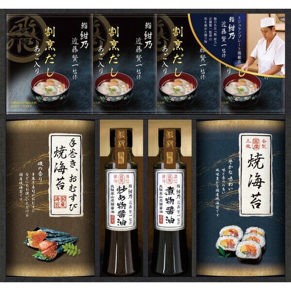 ●内容量:鮨 紺乃 近藤賢一監修(あご入り割烹だしパック×4、飛騨高山炒め物醤油200ml×1、飛騨高山煮物醤油200ml×1)、手巻き・おむすび用 焼海苔(半切7枚)×1、国産焼海苔(全型3枚)×1