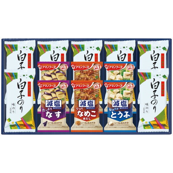 アマノフーズの減塩タイプみそ汁と白子のり味のりを詰合せました。