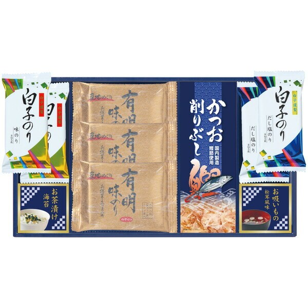 ●内容量:白子のり有明味のり(8切8枚)×3、白子のり味のり(8切5枚)、白子のりだし塩のり(8切5枚)×各2、永谷園お茶漬け海苔(4.7g×2)、永谷園お吸いもの松茸風味(2.3g×2)、かつお削りぶし(1.5g×4)×各1
