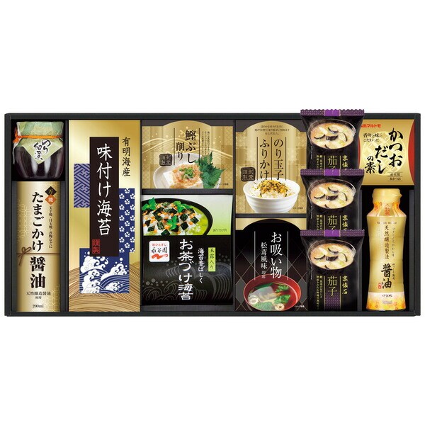 ●内容量:島の香のり佃煮80g、有明海産味付け海苔(3切6枚)、鰹ぶし削り(2g×3袋)、永谷園お茶づけ海苔(6.3g×3袋)、のり玉子ふりかけ(4.5g×2袋)、永谷園お吸い物松茸風味(2.3g×4袋)、マルトモかつおだしの素(4g×4袋)、伊賀越たまごかけ醤油200ml、伊賀越天然醸造しょうゆ200ml×各1、マルコメ京懐石茄子のおみそ汁11.5g×3